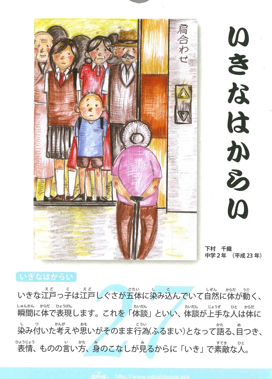 いきな江戸っ子は江戸しぐさから五体に染み込んでいていて自然に体が動く、瞬間に体で表現します。これを「体談」といい、体談が上手な人は身体に染み付いた考えや思いがそのまま行為(ふるまい)となって語る、目つき、表情、ものの言い方、身のこなしが見るからに「いき」で素敵な人。