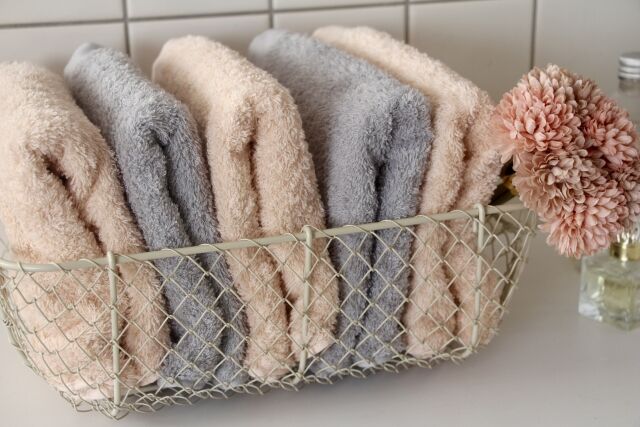 たくさんのタオルを積んで