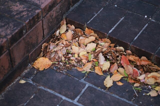 ・駐車場の隅にゴミや落ち葉が吹き溜まり